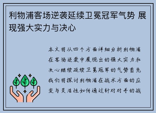 本文将从四个方面详细分析利物浦在客场逆袭中展现出的强大实力和决心,继续延续卫冕冠军的气势。首先,我们将探讨利物浦在战术方面的应变与灵活性,如何通过针对对手的战术布置取得优势。接着,文章会分析球队的精神...